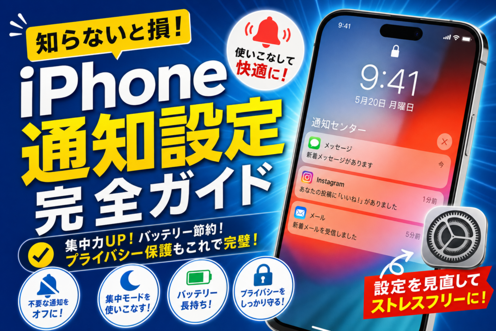 iPhoneの通知設定を徹底解説。アプリごとの通知オン/オフ、バナー表示の変更、通知センターの整理方法、集中モード活用まで、邪魔な通知をスッキリ管理する方法をすべて説明します。 -
