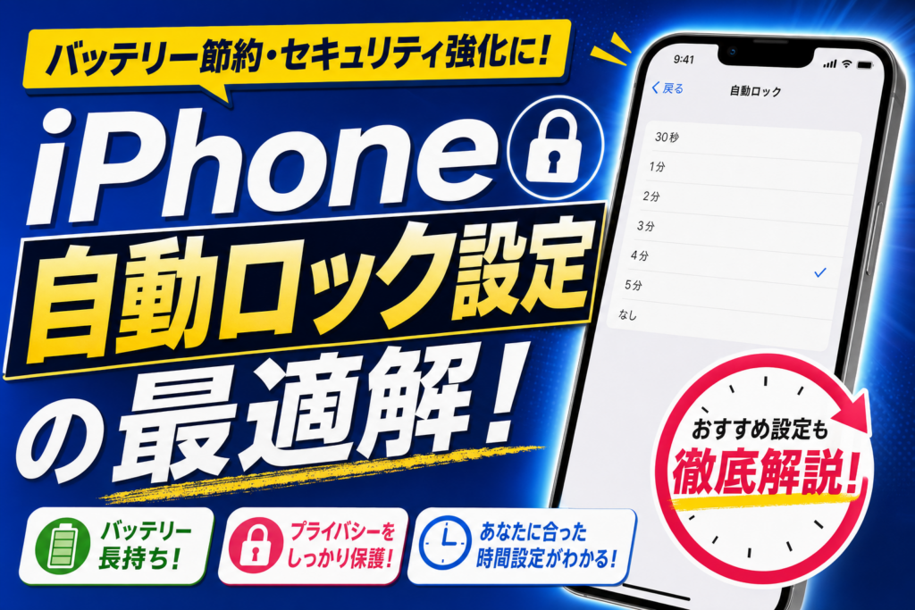 iPhoneの自動ロックは、画面が自動でオフになるまでの時間を設定する機能です。バッテリー節約のために短く設定したり、作業中は「なし(Never)」にしたりと、用途に合わせて変更できます。この記事では設定手順・注意点・よくあるトラブルを完全解説しま...