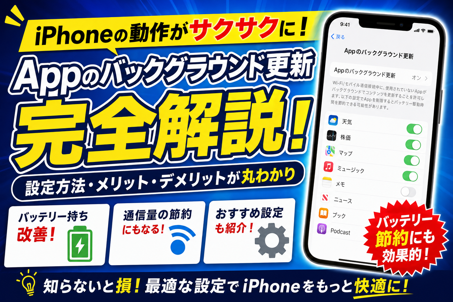 iPhoneの「バックグラウンドアプリ更新」って何?オフにしても大丈夫?バッテリーに関係あるの?という疑問を解消します。この機能の仕組みとバッテリーを長持ちさせる設定方法を解説します。