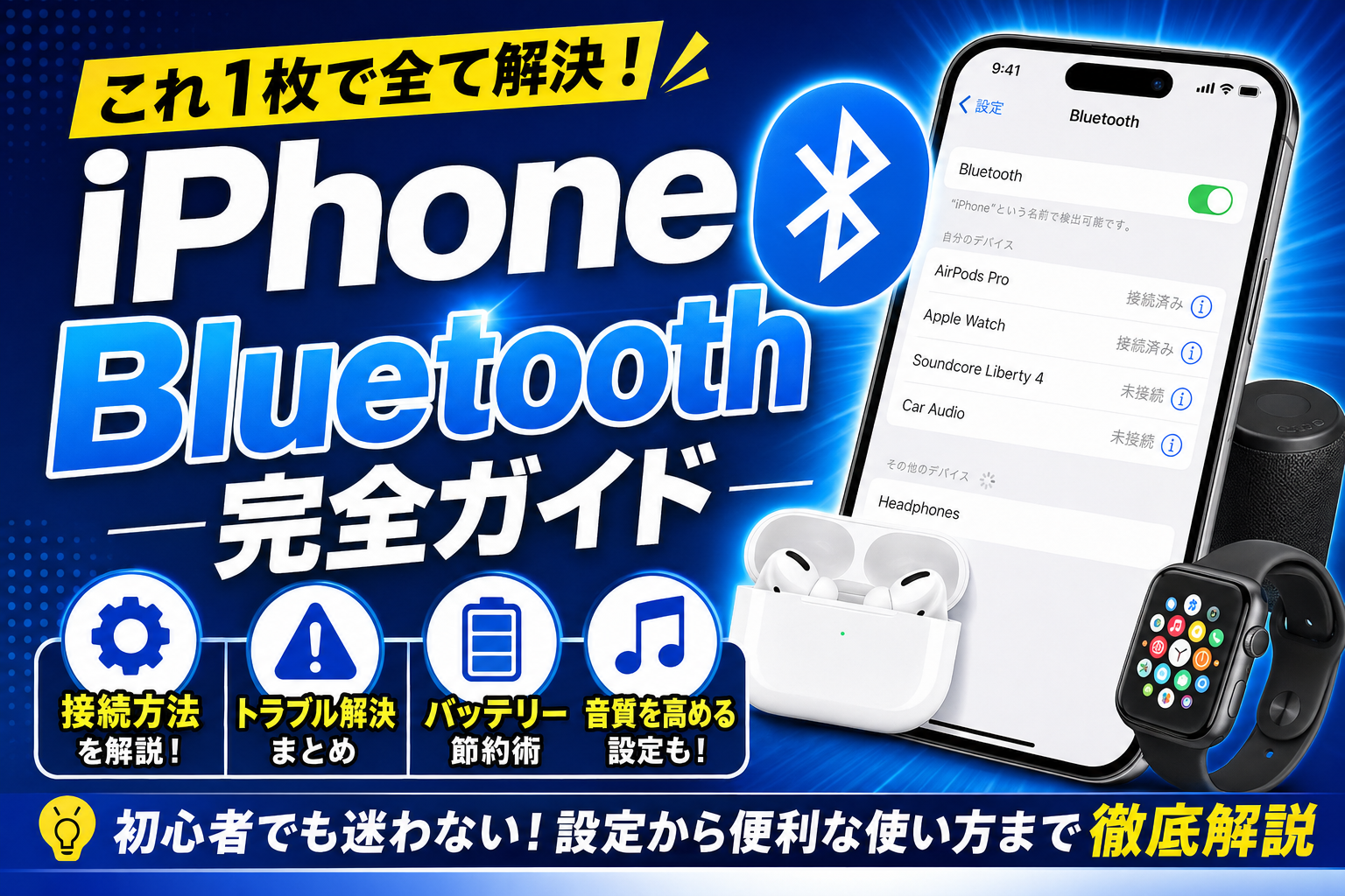 iPhoneのBluetoothでワイヤレスイヤホンやスピーカー、カーナビなどを接続する方法を解説します。ペアリング手順から、接続できない時のトラブルシューティングまで完全ガイドです。