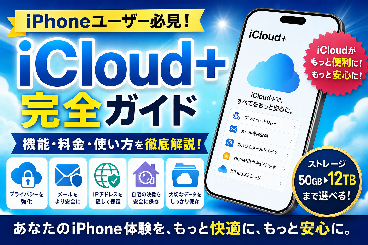 iCloud+機能(プライベートリレー・メールを非公開に)はすべてのプランで使えます。家族と共有したいなら200GB以上がお得です。