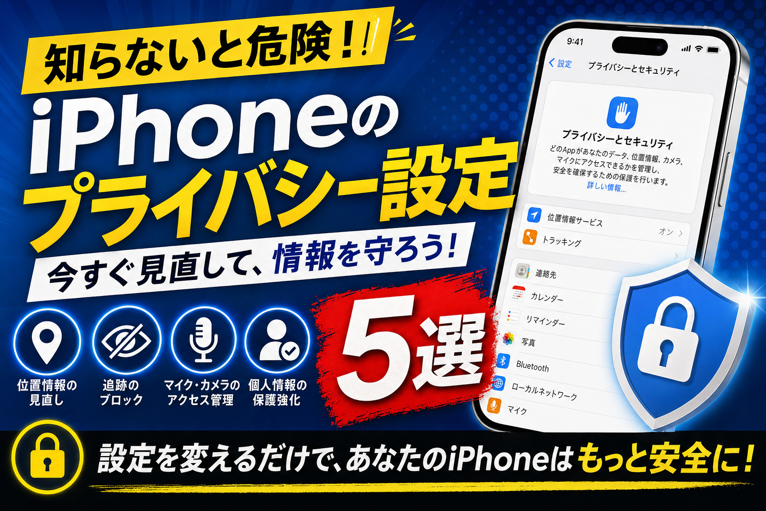 iPhoneにはアプリのプライバシーを細かく管理できる設定が揃っています。位置情報・カメラ・マイク・トラッキングなど5つの重要プライバシー設定をわかりやすく解説します。