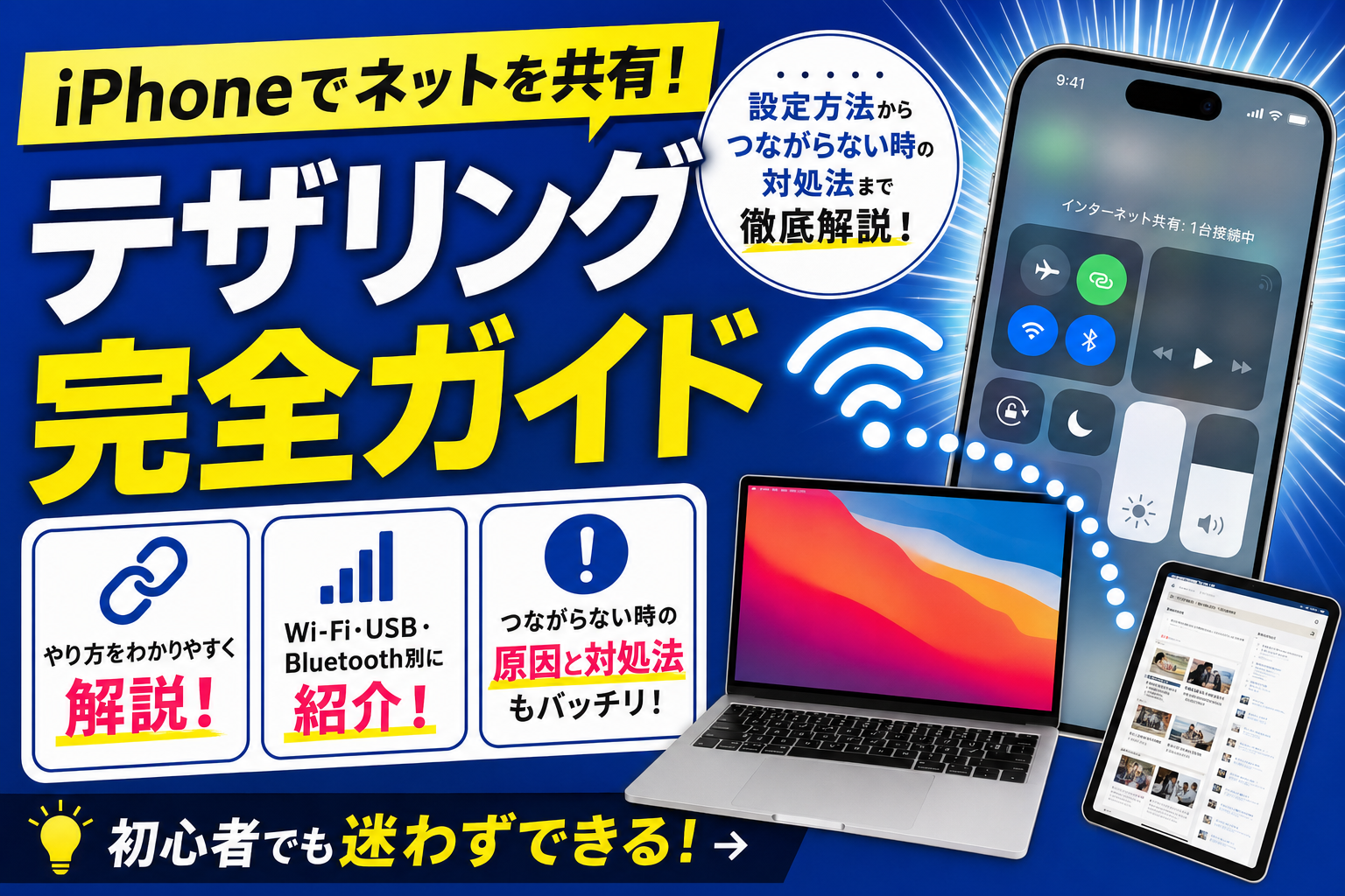 テザリングとは、iPhoneのモバイルデータ通信を他のデバイスと共有する機能です。Wi-Fiがない場所でもノートPCやタブレットをネットに繋げられます。