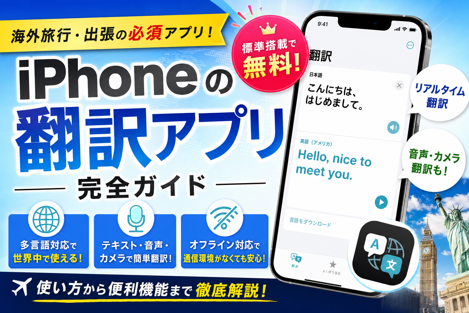 iPhoneには標準の翻訳アプリが内蔵されており、テキスト翻訳・音声翻訳・カメラ翻訳・Web翻訳まで無料で使えます。翻訳アプリの使い方から便利なワザまで完全解説します。